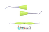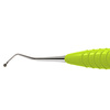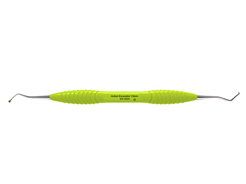 Exkavator med runda arbetsdelar och skäregg, 1,5 mm. För att avlägsna kariöst dentin, för depurering av konkava ytor samt för avlägsnande av granulationsvävnad i samband med apikal resektion, flapoperation och extraktion. Ergonomiskt ljusgrönt (lime) silikonhandtag, Ø 12 mm.