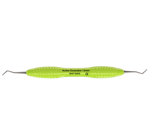 Exkavator med runda arbetsdelar och skäregg, 1,5 mm. För att avlägsna kariöst dentin, för depurering av konkava ytor samt för avlägsnande av granulationsvävnad i samband med apikal resektion, flapoperation och extraktion. Ergonomiskt ljusgrönt (lime) silikonhandtag, Ø 13,5 mm.