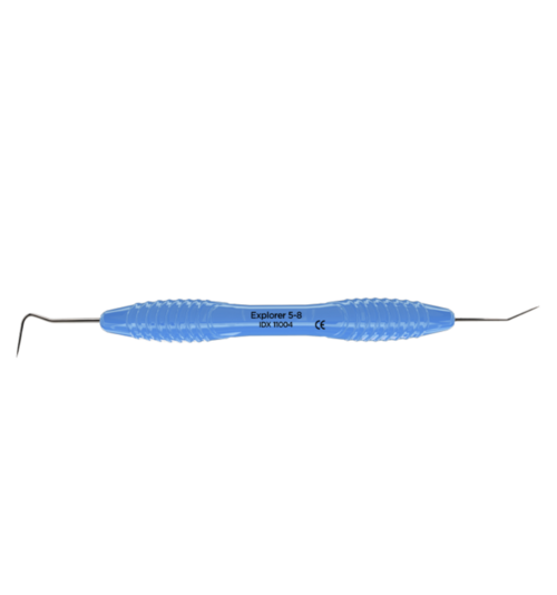 Dubbeländad sond av rostfritt stål för diagnostisering av tandsten och karies, används även för undersökning av parodontala fickor och furkationer. Ergonomiskt blått silikonhandtag, Ø 13,5 mm.