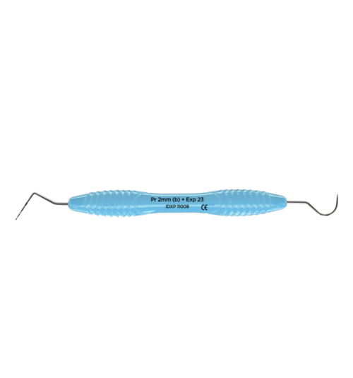 Dubbeländad undersöknings- och fickmätningssond med kula av rostfritt stål och gradering 2-4-6-8-10-12 mm. Ergonomiskt blått silikonhandtag, Ø 13,5 mm.