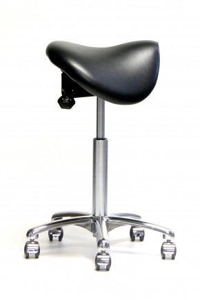 Sadelstol vinyl std färger. Liten, mjuk sits med smal utformning. Spakar för höjd och vinkeljustering av undersitsen. Underredet är kromat med mjuka hjul för hårda golv som standard. Gaspelare anpassas till användarens längd för optimal arbetsställning. De flesta sadelstolar kan utrustas med fotaktivator och ryggstöd.