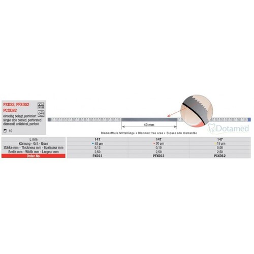 Flergångs och enkelsidiga diamantstrips, med ett blankt parti på mitten. Används för konturering och borttag av överskott approximalt. Stripsen är av mycket hög kvalitet, vilket gör att de håller längre utan att gå av.