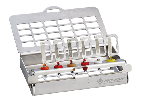 Autoklaverbar rostfri bricka med tillbehör för skapande av interproximalt utrymme mellan intilliggande tänder i förhållande till de kliniska kraven av IPR (InterProximalReduction) strippningsprotokoll. Diamantbeläggning på båda sidor av remsorna.