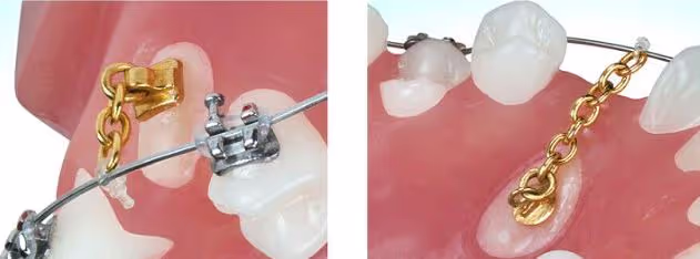 Fäst guldkedjans bas på en inverterad tand och applicera sedan dragkraft för att börja behandlingen.