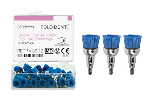 PoloDent pensel, profylaktisk nylonborste med skruvfattning. Liten storlek för barn. Färgkodad med 3 olika hårdheter: mjuk, medium och hård. Lämplig för t.ex. rengöring av missfärgade tänder. Max. varvtal. 10 000.