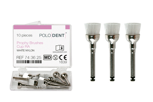 Vit koppformad tandrengörings- och polerborste av nylon med vinkelstyckefattning.