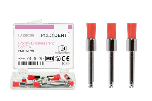 PoloDent pensel, profylaktisk nylonborste av RA-typ. Färgkodad med 3 olika hårdheter: mjuk, medium och hård. Lämplig för rengöring av missfärgade tänder. Max varvtal 10 000.