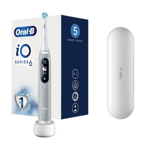 Vit eltandborste med iO-teknik och runt borsthuvud med mikrovibrerande borst.