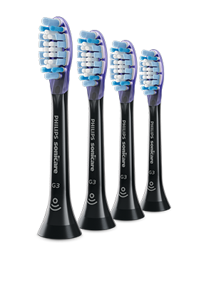 Svart tandborsthuvud med chip till Sonicare Smart Connected eltandborste med sonisk teknologi. Huvudet har mjuka borststrån samt mjuka flexibla sidor av gummi som anpassar sig efter tandköttets konturer och ger en bra ytkontakt för plackborttagning längs tandköttskanten. De blå påminnelseborststråna bleknar och blir vita när det är dags att byta borsthuvud. Märkt: G3.