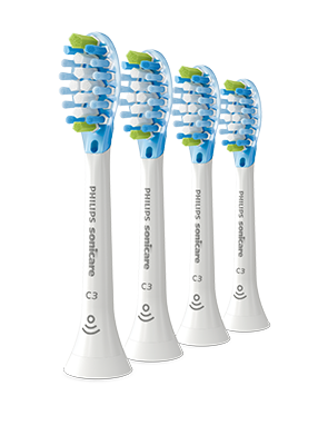 Vitt tandborsthuvud med chip till Sonicare Smart Connected eltandborste med sonisk teknologi för effektiv djuprengöring. Huvudet har mjuka flexibla sidor av gummi som gör att de medelmjuka borststråna på borsthuvudet kan anpassa sig efter ytan på varje tand. De blå påminnelseborststråna bleknar och blir vita när det är dags att byta borsthuvud. Märkt: C3.