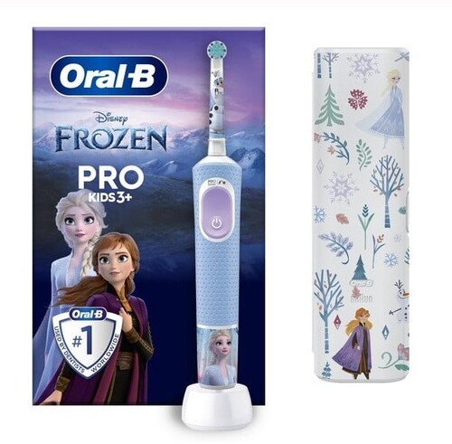 Oral-B Vitality Pro Kids Frozen 3+ med resefodral är en laddningsbar eltandborste för barn från 3 år, utformad för skonsam men effektiv daglig tandborstning med Frost-tema och ett resefodral för förvaring och transport.