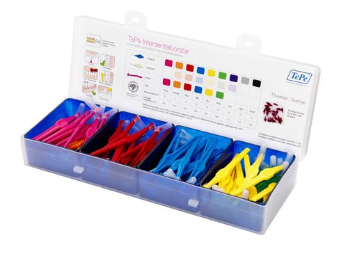 Praktisk kliniklåda i plast med 4-fack för TePe Angle interdentalborstar, varje fack rymmer 15 st borstar. Behändig vid utprovning och instruktion. Storleksguide medföljer på lockets insida. Raka mellanrumsborstear med plastöverdragen metalltråd på ett litet och vinklat borsthuvud för att enklare nå in approximalt posteriort samt från palatinal-och lingualsidorna.