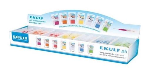 EKULF ph displaybox, innehåller 24 EKULF ph mellanrumstandborstar av varje storlek. Boxen är gjord av miniwell och tar liten plats på hyllan eller bänken.