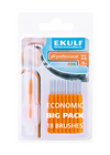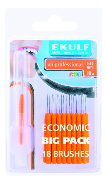 Ekulf pH professional mellanrumstandborste har 400-1000 små, fina och tunna borststrån och en rostfri, plastbelagd ståltråd som skyddar tänderna. Levereras med 18 st borstar i varje förpackning tillsammans med en skyddshylsa samt greppförstorare.