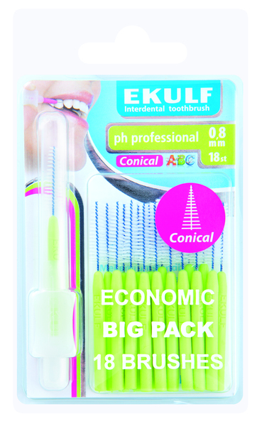 Ekulf pH professional mellanrumstandborste har 400-1000 små, fina och tunna borststrån och en rostfri, plastbelagd ståltråd som skyddar tänderna. Levereras med 18 st borstar i varje förpackning tillsammans med en skyddshylsa samt greppförstorare.