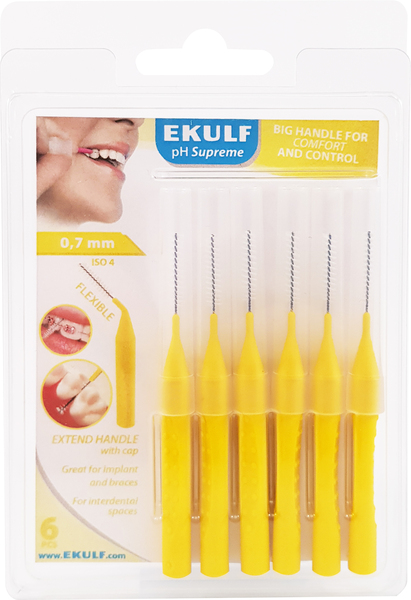 Avsedd för de som behöver lite större grepp på mellanrumstandborstar. Samtliga borstar är cylindriskt utformade och har hög kvalité på borst- och rengöringsförmåga. Med varje förpackning medföljer ett förlängningsskaft som kan användas som skydd för borsten samt för att enklare nå de bakre tänderna. Levereras i en praktisk återförslutningsbar förpackning.