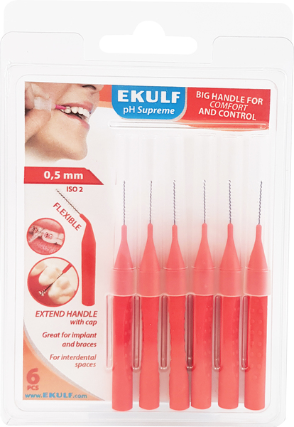 Avsedd för de som behöver lite större grepp på mellanrumstandborstar. Samtliga borstar är cylindriskt utformade och har hög kvalité på borst- och rengöringsförmåga. Med varje förpackning medföljer ett förlängningsskaft som kan användas som skydd för borsten samt för att enklare nå de bakre tänderna. Levereras i en praktisk återförslutningsbar förpackning.