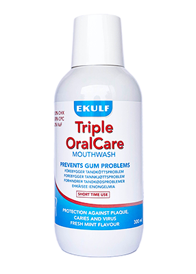 Munskölj i en triple kombination av ingredienser Innehåller 0,12 % klorhexidin (CHX) som har god effekt vid tandköttsinflammation, en hög fluorhalt 0,2 % fluor som förebygger karies samt 0,05 % cetylpyridinklorid (CPC) som motverkar virus. För korttidsbehandling. God mintsmak som ger en frisk andedräkt.