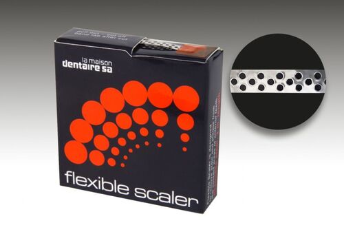 Mycket tunt rostfritt scalerstrips med perforeringar. Kanterna på dessa perforeringar är mycket vassa och tar bort interproximal tandsten, fläckar och rester av resin cement efter limning av porslinsrestaureringar.