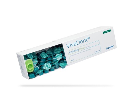Medium puts- och polerpasta i smidig stänkfri konsistens för professionell tandrengöring.
