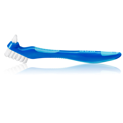 GUM® Protesborste har ett plattklippt borsthuvud av styva avsmalnande nylonstrån som effektivt rengör tandprotesens ytor. Den har även en sida med spetsklippt borst för att göra rent andra områden som kan vara svåra att nå. Borsten har ett bekvämt vinklat handtag med mjukt grepp som ger en bättre kontroll när du borstar.