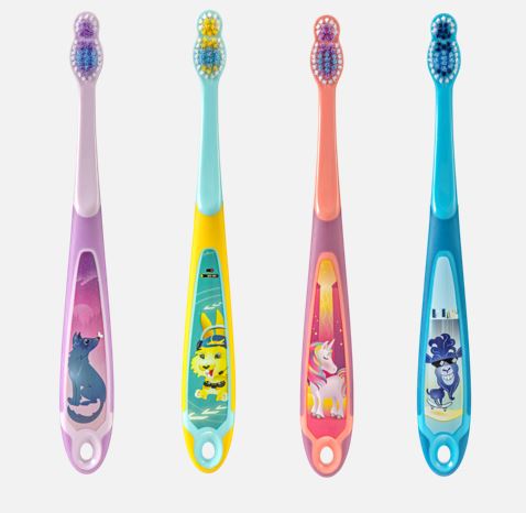 Barntandborste med litet mjukt borsthuvud med 2 x active tip och tandkrämsindikator.