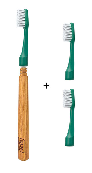 Tandborste i modern design med ett återanvändbart skaft i svenskt bokträ och med 3 st utbytbara borsthuvuden i samma färg.