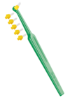 Vinkelborste med spetsklippt mjukt borstknippe för rengöring av svåråtkomliga ytor. Den gula borsttippen är utbytbar och kan skruvas fast på skaftets fram- eller baksida för olika vinkel. Skaftet är böjbart efter uppvärmning.