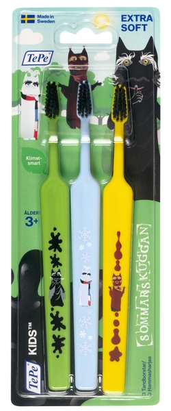 En färgglad hållbar Select tandborste med extra mjuka borststrån för barn från 3 år med motiv av Sommarskuggan och vänner.