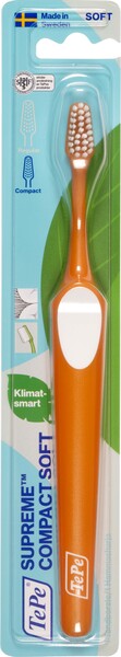 TePe Supreme™ Compact är en innovativ tandborste med strån i två nivåer. Utformningen ger en mer effektiv rengöring mellan tänderna och längs med tandköttet.