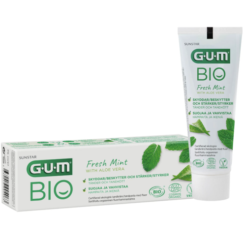 Ekologisk certifierad, vegansk tandkräm som inte innehåller några mikroplaster och inte är testad på djur. Med 99% naturliga ingredienser och 22% ekologiska ingredienser är GUM BIO Tandkräm extra skonsam mot tandkött och tänder. Innehåller fluor och uppfyller samma kriterier som andra GUM tandkrämer. Med ekologisk aloe vera och ekologisk pepparmynta för att säkerställa en uppfriskande frisk mun.