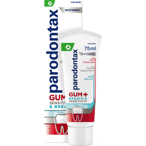 Parodontax Gum Sensitive & Breath White tandkräm effektiv mot tandköttsproblem, förebygger ilningar i tänderna och neutraliserar bakterier som orsakar dålig andedräkt. Innehåller fluor 1426 ppm.