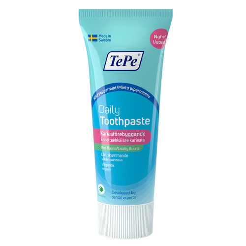 TePe Daily är en skonsam lätt skummande fluortandkräm med mild pepparmintsmak. Inga tillsatser av SLS eller konserveringsmedel. Kan kombineras med klorhexidin. Innehåller 1450 ppm fluor. RDA 50-60. Vegansk. Rekommenderas från 6 år.