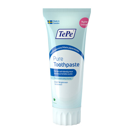 Extra mild tandkräm som är speciellt anpassad för personer med muntorrhet och känsliga munslemhinnor. Har en mild smak av pepparmint, innehåller fluor (1450 ppm) och xylitol. Skummar inte och innehåller inga färg- och konserveringsmedel eller SLS.