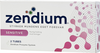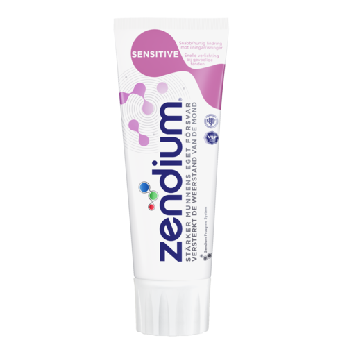 Tandkräm som är speciellt framtagen för att motverka ilningar i tänderna. Därför innehåller tandkrämen kaliumnitrat i 5%. Kalium höjer retledningströskeln i fria nervändslut i pulpan. Nitrat denaturerar proteiner i dentinkanaler. Fluorföreningen är natriumfluorid som förebygger karies och ilningar. zendium Sensitive innehåller också enzymer och colostrum och har en dokumenterad effekt mot plack. Tandkrämen innehåller, precis som zendiums övriga tandkrämer, ett milt skummedel som gör den extra lämplig för personer med torra och känsliga munslemhinnor. Innehåller små mängder ägg/mjölkproteiner. 1450 ppm NaF.