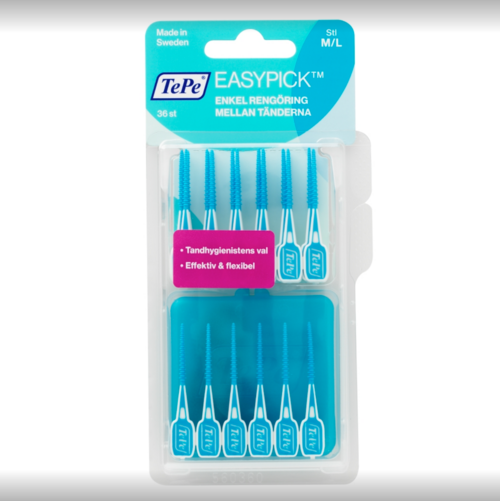TePe EasyPick är en tandsticka med ett stadigt skaft och silikonlameller för att effektivt göra rent mellan tänderna. Tandpetaren är enkel att använda och så flexibel att man lätt kommer åt både mellan de främre och de bakre tänderna. Det medföljer ett ficketui så att man enkelt kan ta med tandpetarna i väskan eller fickan.