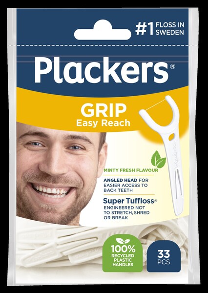 Plackers Grip tandtrådsbygel med Tuffloss-tråd med mintsmak har längre och stadigare skaft och ett roterat tandtrådshuvud för bättre åtkomst till de bakre tänderna. SUPER TUFFLOSS-tråden är speciellt utformad för att inte gå sönder och är så stark att den kan användas mer än en gång. Tråden glider lätt mellan tänderna och ger en effektiv rengöring.