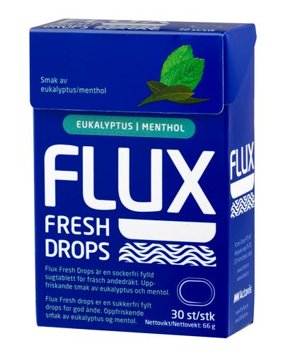 Har en uppfriskande smak av eukalyptus och mentol. Innehåller 0,05 mg fluor/drops.
