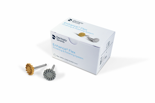 2-stegs finishing-och poleringssystem med flexibla lameller som anpassar sig till alla ytstrukturer. Ytutjämning med orange Finisher och slutpolering med grå diamantimpregnerad polerare för alla kompositplaster.