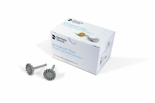 Tvåstegs finishing-och poleringssystem med flexibla lameller som anpassar sig till alla ytstrukturer. Ytutjämning med orange Finisher och slutpolering med grå diamantimpregnerad polerare för alla kompositplaster.