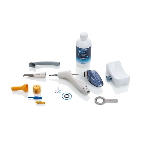 Förpackning: MyLUNOS luftpolerare med supraspets, 1 st blå Supra pulverkammare med ställ, 180 g Lunos Gentle Clean neutral profylaxpulver, 1 st grå profylaxsug flergångs, O-ringset, adapterset automatiskt och manuellt.