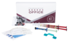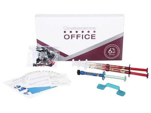 2 x 1.2 ml Opalescence Office/Activator syringes, 1 x 1.2 ml OpalDam Green syringes, 1 x IsoBlocks, 1 x Shade guide cards, 10 x Black Mini Tips