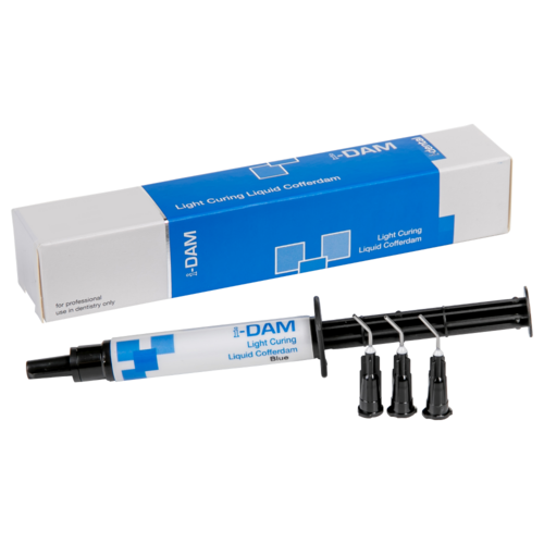 I-DAM är en lätt härdande flytande kofferdam som sätts som barriär för isolering av mjukvävnaden kring tänderna och ersättning för gummiduken för att skydda tandköttsvävnaden i de fall det finns risk för irritation vid kontakt med produkter som används i kliniska förfaranden, t.ex. tandblekning med väteperoxid. Produkten är tillräckligt viskös och gör det enkelt att applicera och hålla kontroll på den plats som ska skyddas. Blå färg för att skapa kontrast till tandköttsvävnaden och tänderna och på så sätt underlätta lokaliseringen.