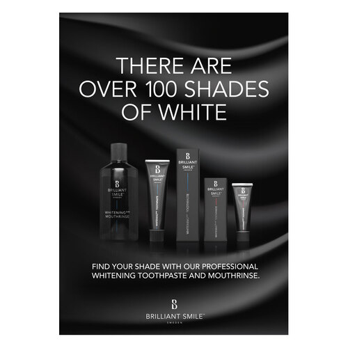 Väggplansch med texten: "THERE ARE OVER 100 SHADES OF WHITE", med fokus på munvård.