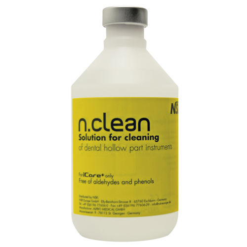 n.Clean används för att rengöra vinkelstycken utvändigt och invändigt i maskinen iCare+ från NSK. Hela flaskor med n.Cid och n.Clean sätts in i maskinen så det blir inget spill vid påfyllnad av vätska.